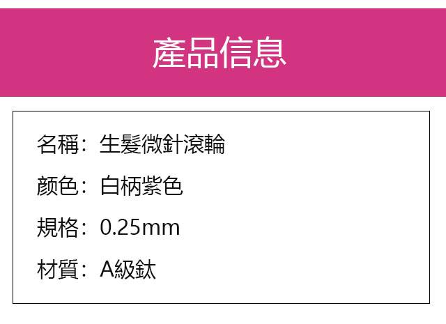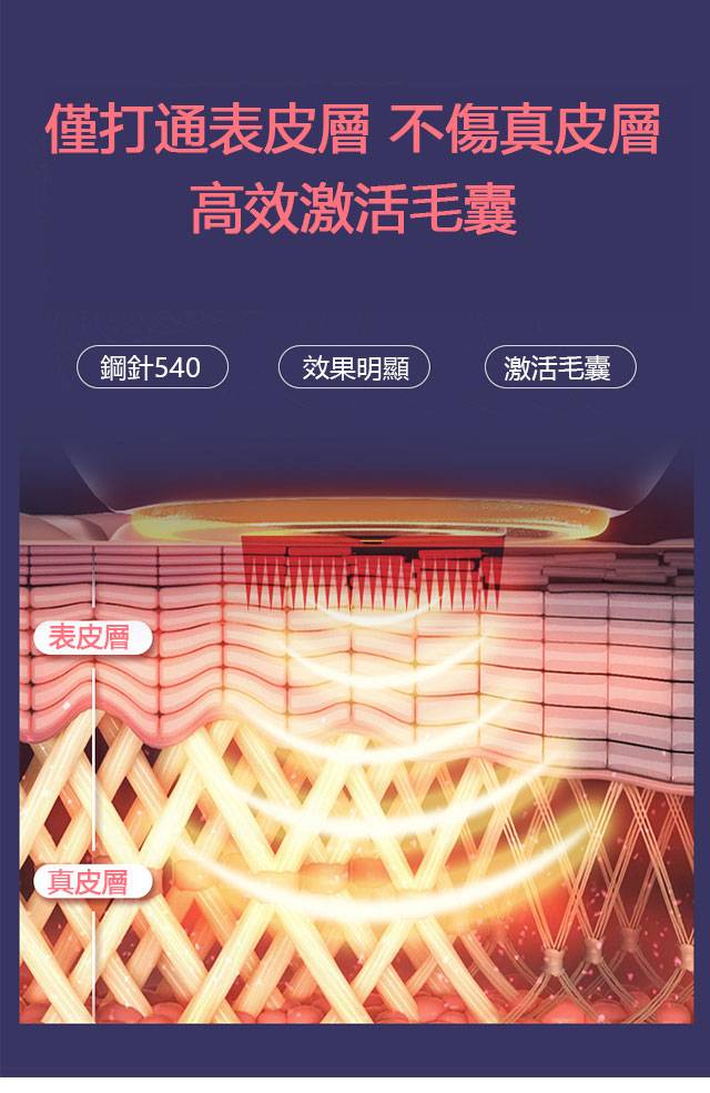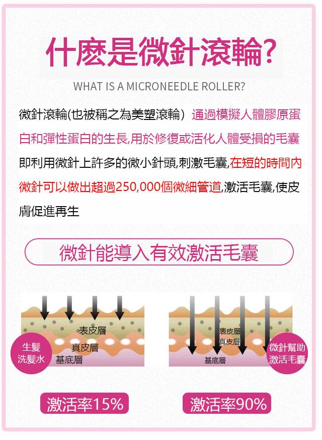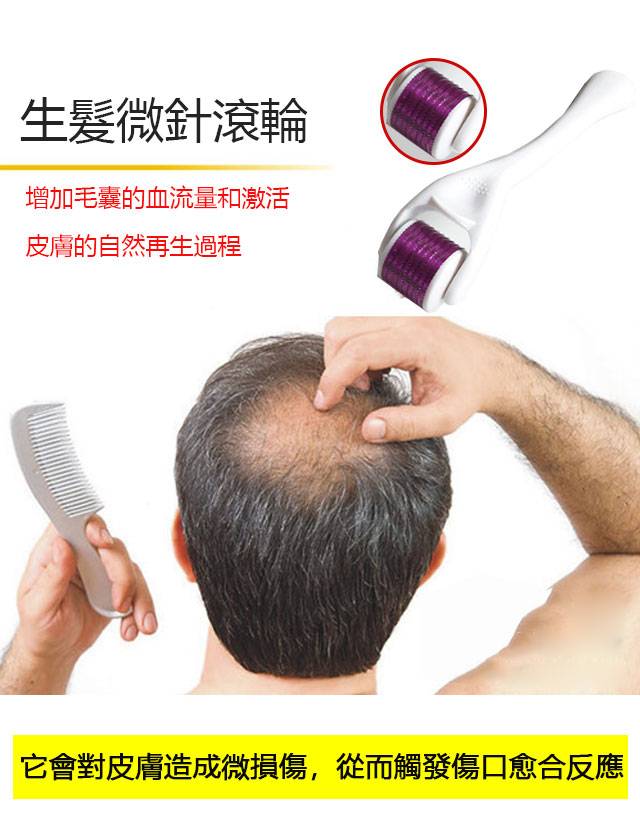 生髮微針滾輪其應用原理是藉由帶著數百根鋼針的滾輪在頭部來回均勻的滾動,直接透過表皮與真皮之間做出許多微針小孔,而造成組織的微小創傷,刺激頭皮毛髮再生並直接在皮膚上打開通道以便有效成分滲透,進入皮膚被吸收,刺激頭髮重新生長可長期維持不會有掉髮現象。