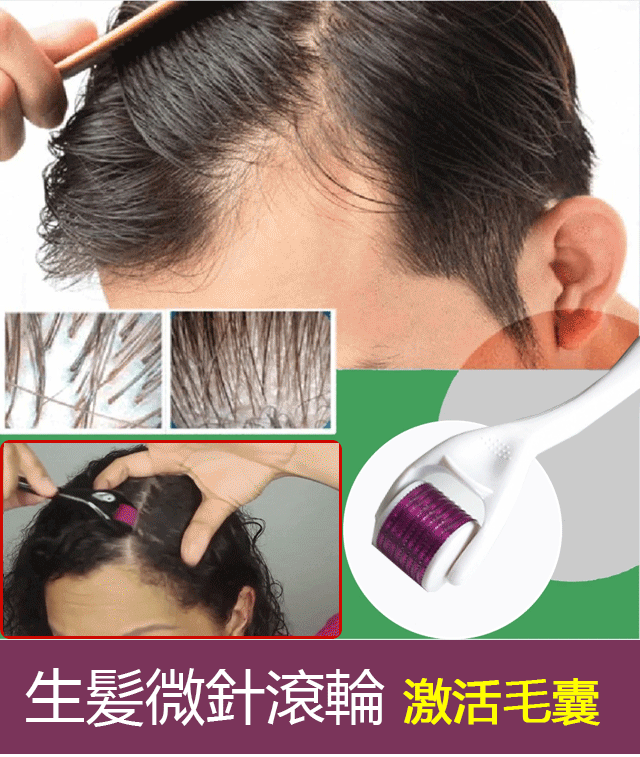 微針滾輪亦能刺激頭皮,對毛囊再生有幫助。雄性禿頭髮稀疏、有落髮危機的人,口服Finasteride、外用Minoxidil的落髮治療外,另有創新技術搭配微針滾輪,可達到促進毛髮生長的作用。